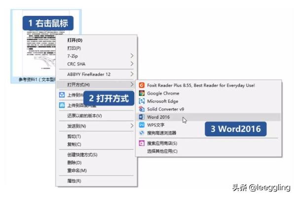 第一步,首先要做的就是选中想要转换的 PDF 文档,右击鼠标选择用 Word2013或2016 打开。