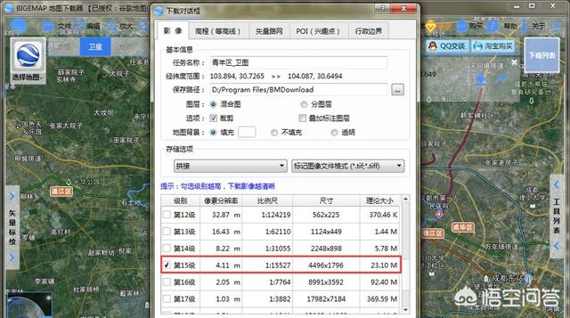 双击选定的边界内部弹出下载对话框,注意选择【下载级别】,级别越高地图越清晰同时数据也更大,其他参数如无特别需求可默认不修改。 下载设置说明:如何下载不同格式的卫星地图