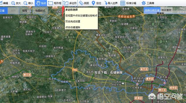 若要下载某个行政区域地图则使用【选择行政区域】功能来确定下载边界;若是要下载指定区域地图则使用顶部菜单【矩形】或者【多边形】工具来确定下载边界。