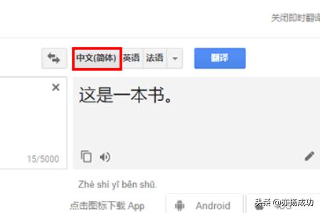 4、接着,再在右侧的目标语言中点选一个要翻译成的语言类型,比如中文(简体)。这时,谷歌翻译就会根据你的要求,给出恰当的翻译结果。