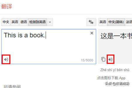 6、翻译完成后,我们还可以点击音量图标收听文字的读音(源语言、目标语言均可点击音量图标收听读音)。