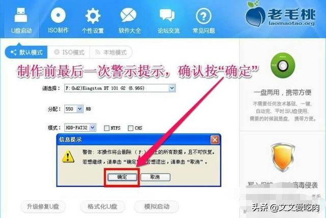 6,弹出制作前的警示,如果执行此操作,会将U盘中原有的数据全部删除掉,如果U盘中有重要的数据,请先将其拷贝出来,如果没有重要的数据或者是全新的U盘,按“确定”即可。