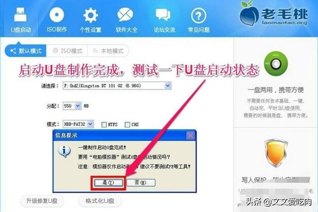 8,在制作完成后,会弹出一个信息提示框,建议你用“电脑模拟器”测试一下刚刚做好的U盘状况,当然,你也可以不测试,但建议还是测试一下,以确定启动U盘是否制作成功。