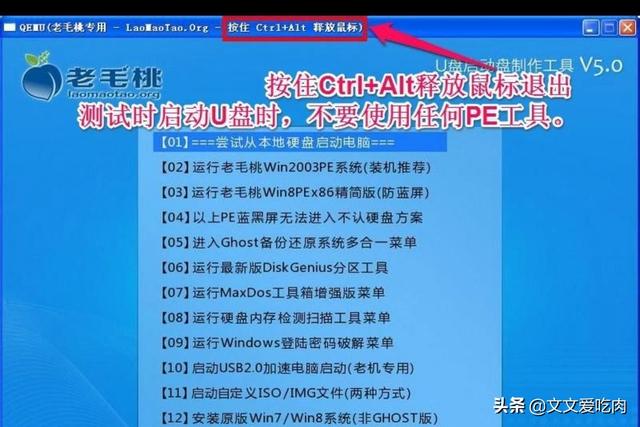 9,这时会显示进入U盘状态,警告,进入启动U盘后,不要做任何操作,只是看一下是否制作成功与否,看完以后,即按Ctrl+Alt释放鼠标退出。