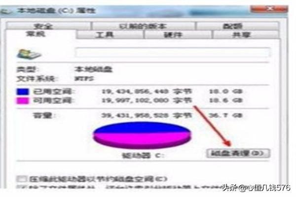3、在属性页中,有一个磁盘清理的按钮,即清理这个磁盘的垃圾文件,用鼠标点击这个按钮。