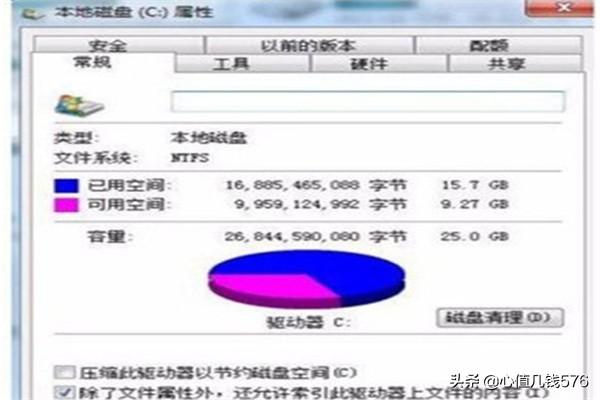 8、如果你的磁盘空间实在太小,你可以在属性页中选中压缩驱动器来节约磁盘空间,通过这种途径可以一定程度上节约空间。