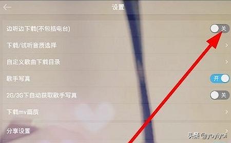 2、找到边听边下载,选项,然后在后面看看是否开启,如果没开启点一下开启,这样以后,听音乐的时候,就能边听边下载了。