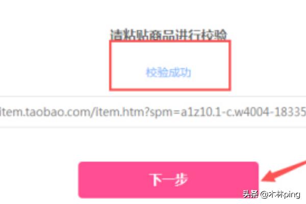 3、把商品链接放在输入框中,进行校验,提示校验成功,点击下一步。若校验后提示商品已存在:表示此商品已有其他淘客提交,并且已审核通过 。