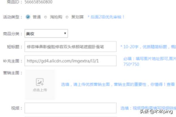 4、基本信息填写: 补充主图需跟商家进行沟通,注意图片尺寸 营销主图为选填,可查看营销主图规范 视频选填 导购文案:可以和商家沟通,文案突出商品的特性,亮点 开始时间:可立即开始,可预告。