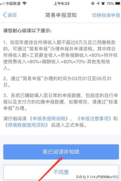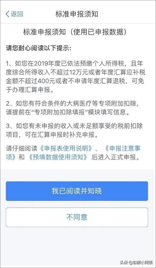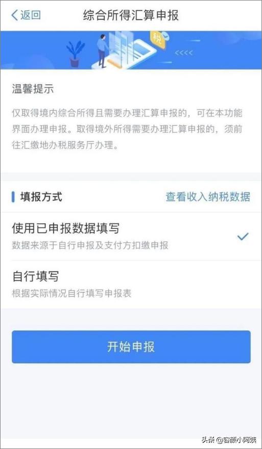 2、选择【使用已申报数据填写】—【开始申报】后,系统提示【标准申报须知(使用已申报数据)】,点击“我已阅读并知晓”,开始年度汇算申报。