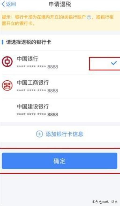 点击【申请退税】后,纳税人需选择退税银行卡。如前期已添加过银行卡,系统将自动带出已填银行卡信息。您需新增,点击【添加银行卡信息】—【确定】。