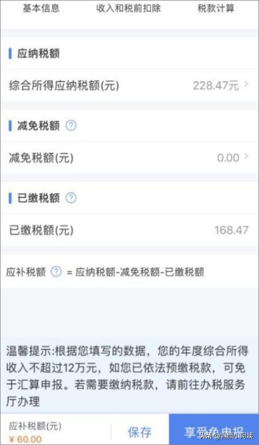 如您综合所得年度汇算需要补税但满足免予汇算条件,则在税款计算后,申报界面直接点击【享受免申报】即可,无需缴纳税款。