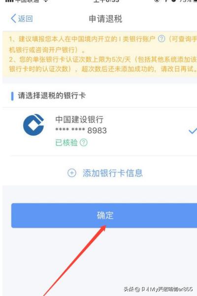 7.最后,点击“继续退税”,选择退税的银行卡,点击“确定”即可。