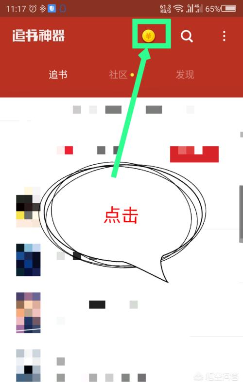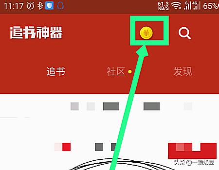 1.在追书神器的主界面,点击顶部的金币图标,在搜索选项的左边。如图所示