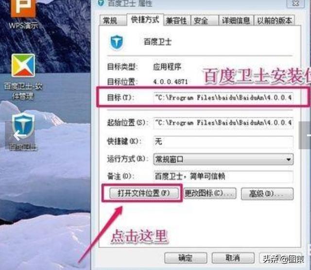2、开机后,找到“百度卫士”和“百度杀毒”的图标,单击鼠标右键,找到“属性”选项并点击,在弹出的窗口中找到“快捷方式”,查看“目标”栏的详细内容,找到软件安装位置,单击打开“文件位置”。