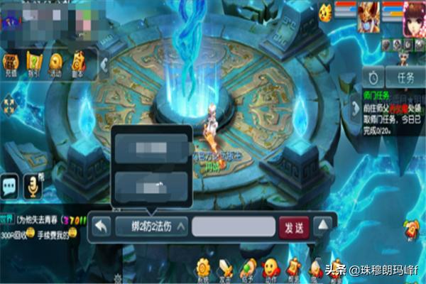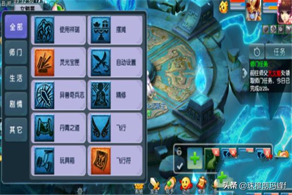 3、主界面快捷技能设置说:在人物主界面点击下方法术按钮,可进行法术快捷设置,例如日常常用的回师门,仙灵店铺,飞行等。另外,玩具箱的打开方式也需要在法术快捷栏设置。