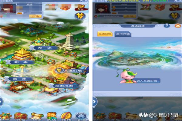 1、在游戏主界面中,点击右侧的【互通幻境】建筑,或者点击右上角的【梦】字,然后点击进入互通幻境,即自动切换到横版视窗,点击进入游戏后,即可体验电脑版的大部分内容。