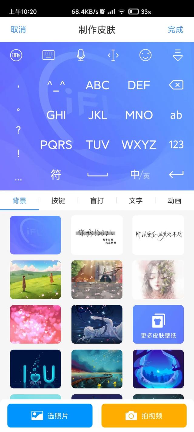 然后根据自己的喜好,分别设置背景、按键、盲打、文字、动画,再点击右上角的完成,就可以了