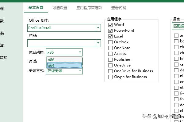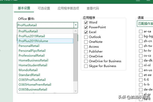 5、接下来是安装,office套件选Proplus2019Vol版,产品选projectpro2019(两个都打勾),然后选择体系构架、通道2019,设置好就可以开始安装了;