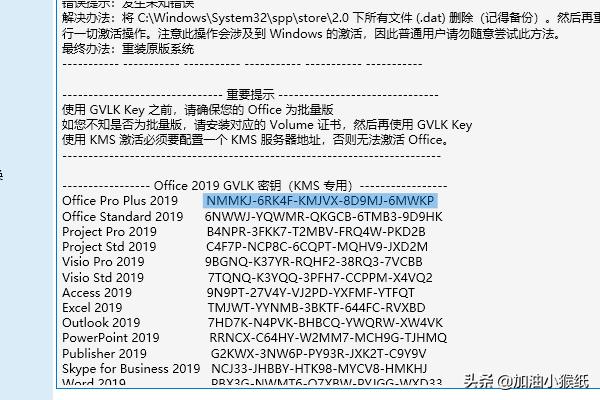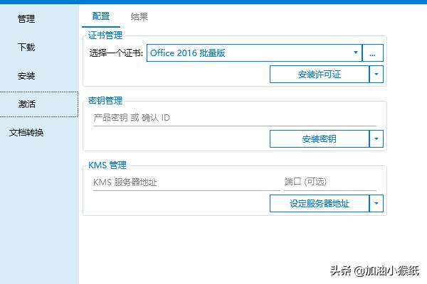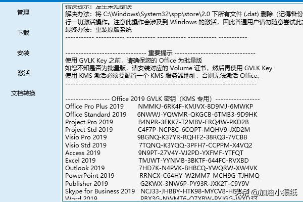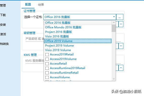 6、安装好之后要进行下一步,激活,证书安装里面选office 2019 Vol,安装许可证,接下来点击右上角的说明,下拉至office 2019密钥,复制第一个密钥,粘贴在密钥管理,点击安装密钥,KMS管理就填上图5的服务器地址,点击激活;
