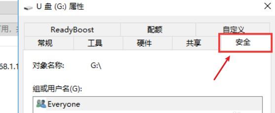 3.在U盘属性设置页面中,选择“安全”这一选项进入U盘权限管理页面。
