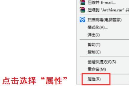 2.在弹出的菜单选项中,点击最后一项,选择“属性”进入U盘属性设置。