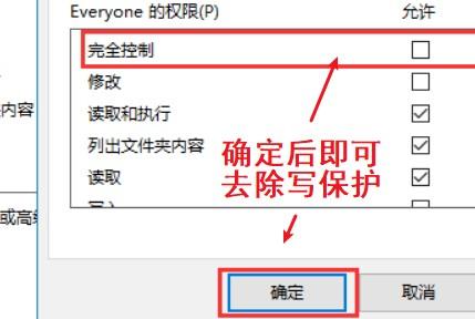 5.在权限编辑页面中,将“完全控制”这一权限勾选“允许”然后点击“确定”后即可成功去除U盘写保护。这就是U盘去除写保护的方法。