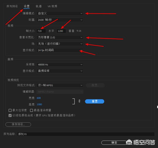 新建序列,选设置。编辑模式选:自定义;时基可以是24或30帧/秒;视频分辨率(帧大小),在手机上看的,可以设置为竖屏的720×1280,1440×2560;横屏的可以把数字换个位置,比如1280×720,1920×1080;场序,设为无场(逐行扫描);其它的默认就可以了。