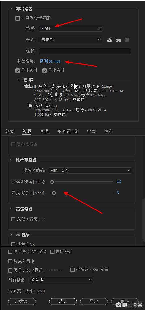 文件?导出?媒体,格式设置为H.264,其兼容性最好。输出名称处,可以指定保存位置及文件名。比特率设置部分,会影响导出的视频文件体积。可以参考下图设置720×1280的视频,可以设置目标比特率1-2M之间,最大比特率在3-4M能满足常用的视频质量。本文的图片视频可以设置为,1M(目标比特率),2M(最大比特率).
