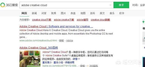 1、使用360搜索引擎搜索“Adobe creative cloud”