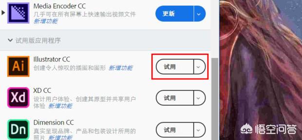 7、安装“Adobe creative cloud”成功后打开,选择列表里面的AI“试用”