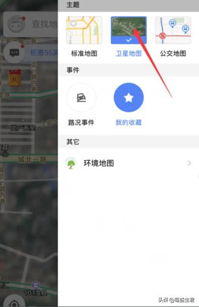 3、点击进入后,在主题下面选择卫星地图模式,如图所示。