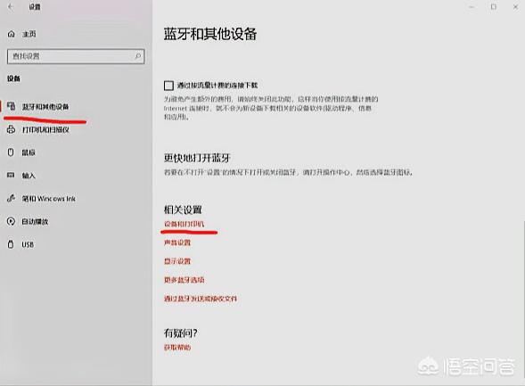 3、在蓝牙和其他设备页面下翻,找到设备和打印机。