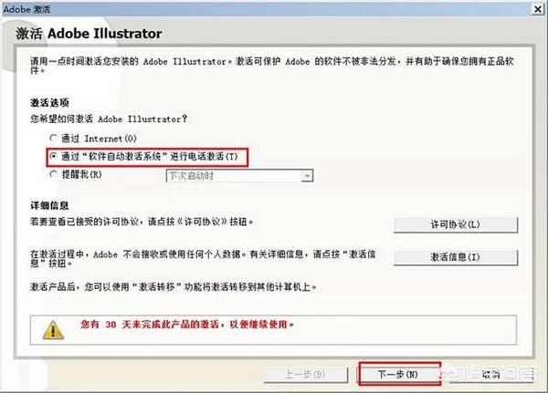 9、勾选“通过软件自动激活系统进行电话激活”,然后点击“下一步”。