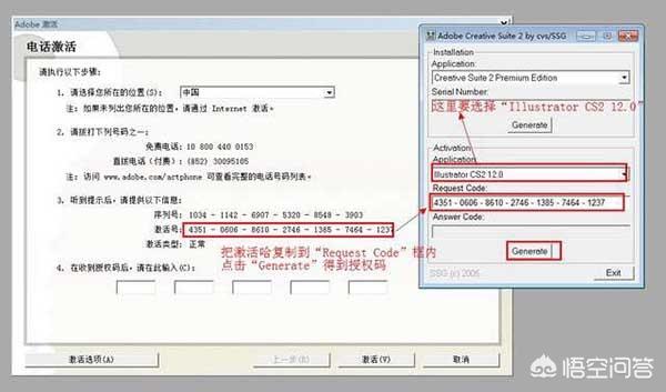 10、打开注册机,在“Application”选项里面选择“Illustrator CS2 12.0”,复制激活码到“Request Code”框内,点击“Generate”得到授权码。