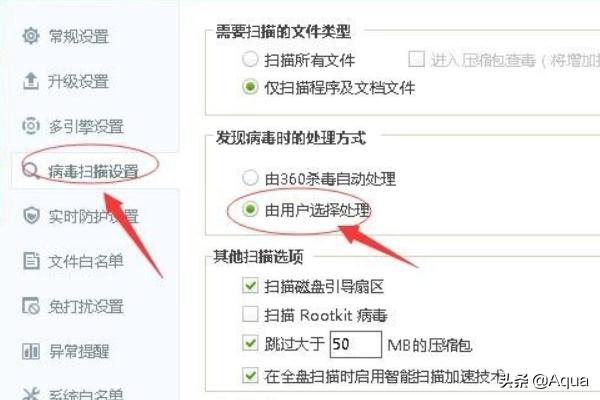 3、弹出杀毒设置,点击“病毒扫描设置”,发行病毒处理方式修改为“有360杀毒自动处理”,这是为了避免处理不及时导致出现问题。