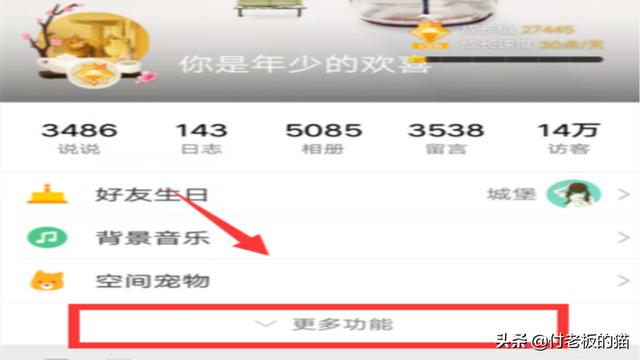 5、如果下载了QQ空间APP,查看去年今日就更加容易,只需进入个人空间主页,点击【更多功能】。