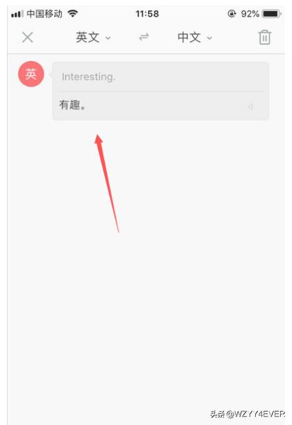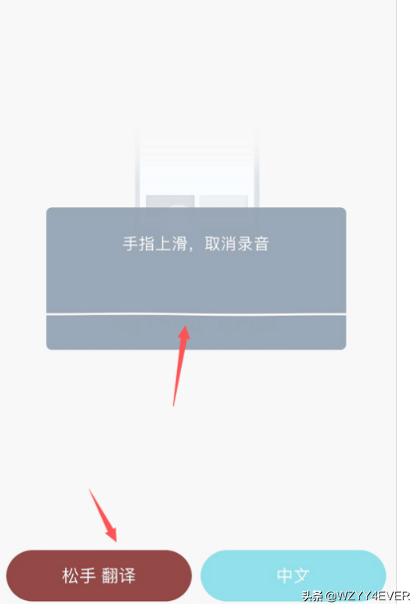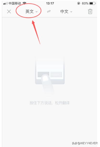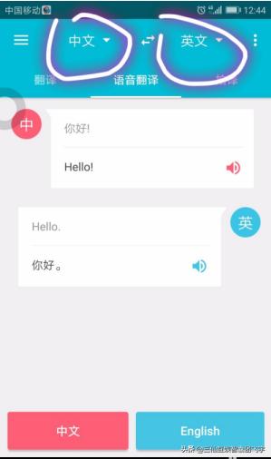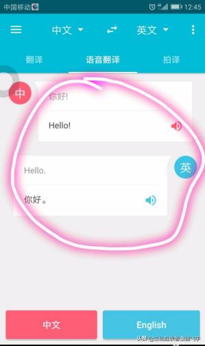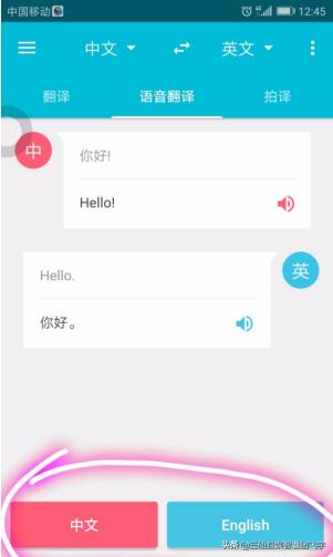 6.选择后,界面下方显示语言键,例如中文英文互译,就会出现中文,英文,按住中文说一句话,就自动翻译成英文。