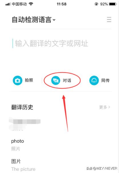 1、首先打开手机有道翻译官首页,在页面里打开 对话,如下图。