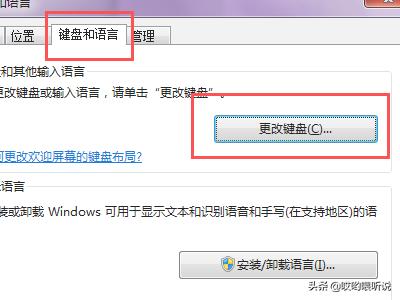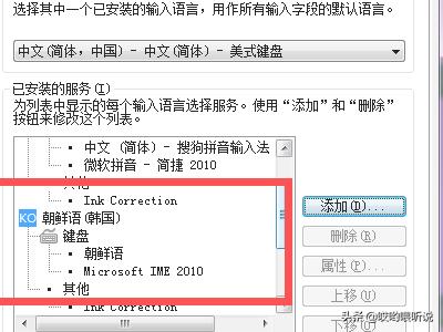 3、单击“区域和语言”则跳出对话框,选择单击“键盘和语言”,然后选择单击“更改键盘”则跳出另外一个小对话框,在该对话框找到“添加”,则在对话框中找到“朝鲜语(韩国),钩选项,点击”确定”