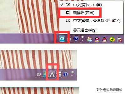 5、回到电脑桌面,在任务栏语言栏中,选择切换至韩语键盘。如果语言栏的输入状态是A,那你现在输入的则只是一串的英文字母。别着急,现在你只要轻轻点击一下语言栏中的A,变成?。那你现在输入的就会是韩文啦。