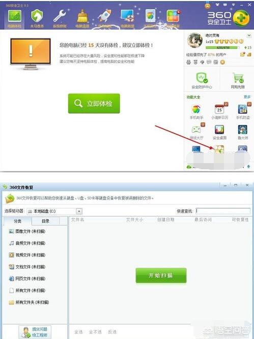 打开安全卫士,选择功能大全,找到数据安全,文件恢复,进入文件恢复界面,首先选择需要恢复数据的U盘,点击开始扫描。等待扫描完成后,可以看到可以恢复的文件,可恢复性越高,恢复文件成功的概率越高。