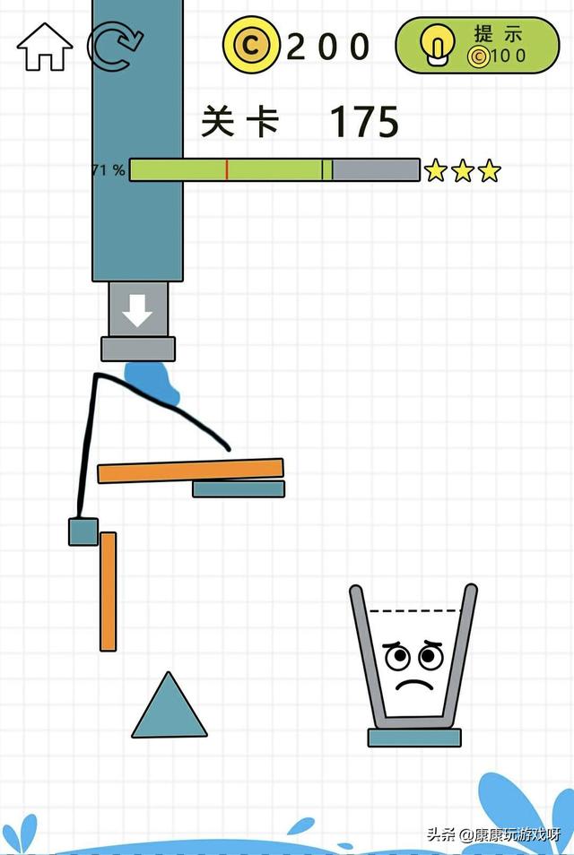 游戏中需要玩家通过画线来将水释到水杯中。在规定时间之后,桶中的水会倾泻而出,在此之前,你就需要画一条阻挡水的线路,为了不让他们洒到杯子之外,所以你的线路需要非常严密才行,任何一个漏洞都有可能会导致游戏失败,这就让这个游戏充满着烧脑的快乐。