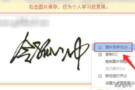 7、选中设计的签名,然后点击鼠标右键,再其右键菜单中选择【图片另存为】,将设计的签名进行存储。剩下的就是,按照设计图片反复对自己的签名进行练习,直到练习到自己满意为止。