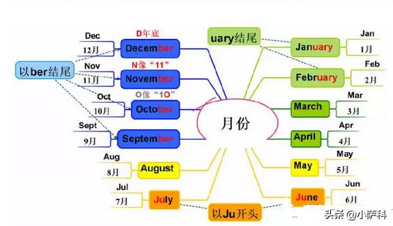 1、January(一月)与February(二月):箭步如飞的月份两个单词都含有共同部分“uary”,只要区分开前三个字母即可。(1)“Jan”可联想中文“箭”。可联想“一”与“箭头”相似。记忆:“箭”。(2)February音头(“Febr”)类似“飞吧”。二月是立春,一般也是春节所在的月份,这个月学生们都放寒假了,都要“飞吧”,飞回家玩去了。也可以联想一年之计在于春,新春伊始,就开始“飞吧”。记忆:新春“飞吧”。2、June(六月)与July(七月):小朋友的月份(1)June与汉语“聚呢”(june)是一样的。六月有儿童节,孩子们肯定会在节日里高兴地过节、聚“聚呢”。记忆:儿童节“聚呢”。(2)July发音类似“就来”。这个月学生要放暑假了,盼望已久的暑假“就来”啦。记忆:暑假“就来”。3、March(三月)与May(五月):节日最美的月份(1)March发音象“妈妻”。三月有妇女节(3月8日),对小孩来说,那是“妈”的节日;对于孩子的父亲来说,那是“妻”的节日。记忆:“妈妈和妻子”的节日。(2)May发音类似“美”。五月有劳动节,劳动最光荣,劳动最“美”。另外,May也是“可以”的意思,联想劳动“可以”使人变“美”丽。劳动“美”。4、April与August(八月)记忆:吃苹果看月亮(1)April的Ap与苹果Apple开头一样,发音也有点类似,想象四月是吃“苹果”的日子。(2)August词头与Autumn开头Au是一样的。八月立“秋”,秋天到了,所以八月与秋天Autumn有相似之处。记忆:秋天“Autumn”。5、September(九月);October(十月);November(十一月);December(十二月):秋去冬来(1)九月September是S字母开头,学生和学校(Student、School)也是S开头。暑假结束了,September是Student到School的日子。Sep也可联想“瑟瑟秋风”。记忆:九月“Student”上“School”。(2)十月October是O开头,单词中间也还有个O字母。十月有国庆节,气球满天飞,气球的形状象“O”。并且,October的发音象“我可投吧”,就可以进一步联想拿着“气球”投掷玩,“我可投吧”!记忆:国庆节玩“气球”——“我可投吧”!(3)十一月November的音头类似“No温”。十一月立冬,冬天来了,当然没有温度啦。记忆:冬天“No温”度。