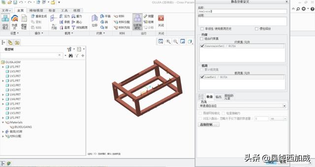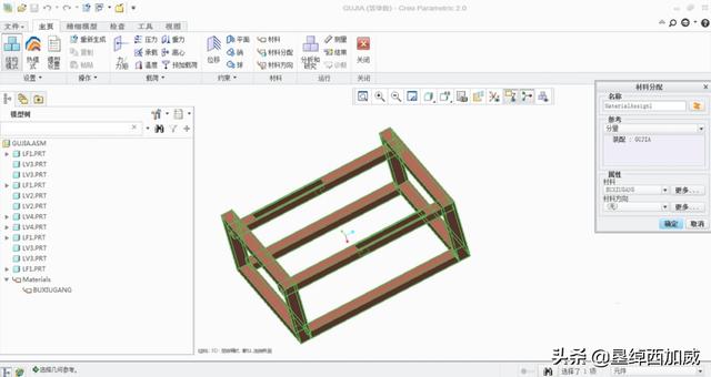 3、第三步,在功能区中选择【材料分布】,开始对零件材料的定义。在导航选项卡中的模型树中,选择需要定义材料的零件。再在材料属性中点击【更多】,选择零件的材料的类型。