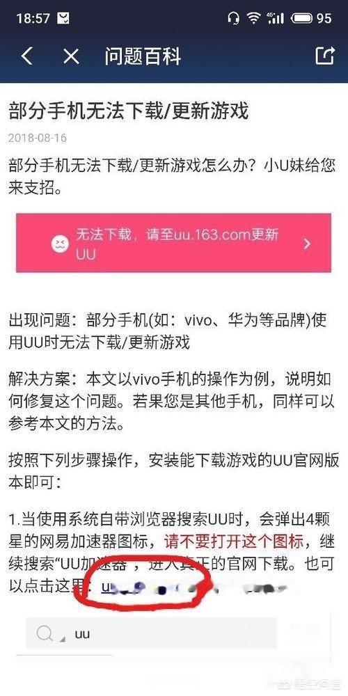 第四步 如果出现无法下载的情况,点击“我的”,然后进入“问题百科”,点击“UU百科”,选择“部分手机无法下载”这条,点击进入,按照给出的官网地址进行应用更新就行。如图所示。