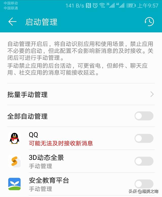 启动管理就是设置自己认为不需要占用后台软件的功能。这个功能相对上面来说比较重要,因为我们手机平常经常安装一些软件,在我们打开和退出的时候,其实他一直停留在后台,一直都在占用你的运存和处理器性能,所以及时关闭这些软件后台频繁启动权限才是必须的。关闭后台保证手机流畅运行的同时,也同样保证了我们更持久的待机时常。何乐而不为呢!