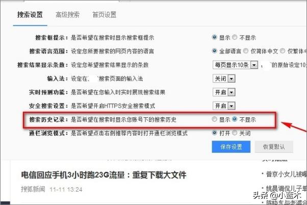4、而且可以看到此时的搜索历史记录是“显示”状态,点击“不显示”,从而将其关闭,保存设置。