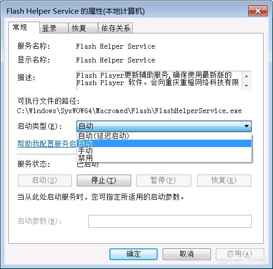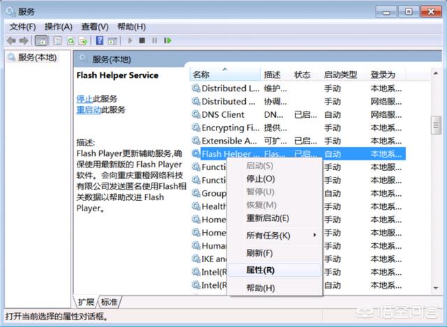 3、接着,右击“Flash Helper Service”,选择“属性”,打开“属性”对话框;